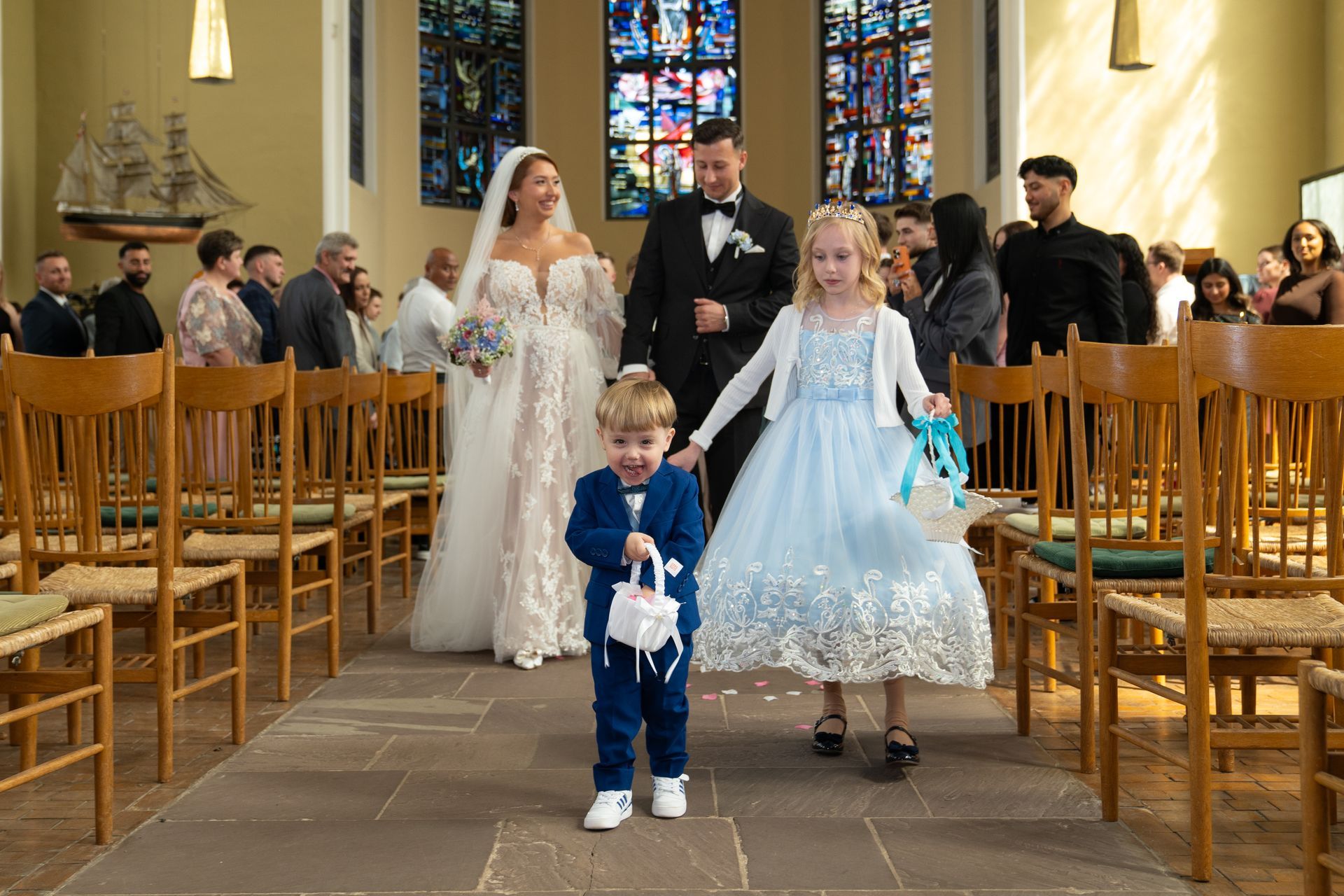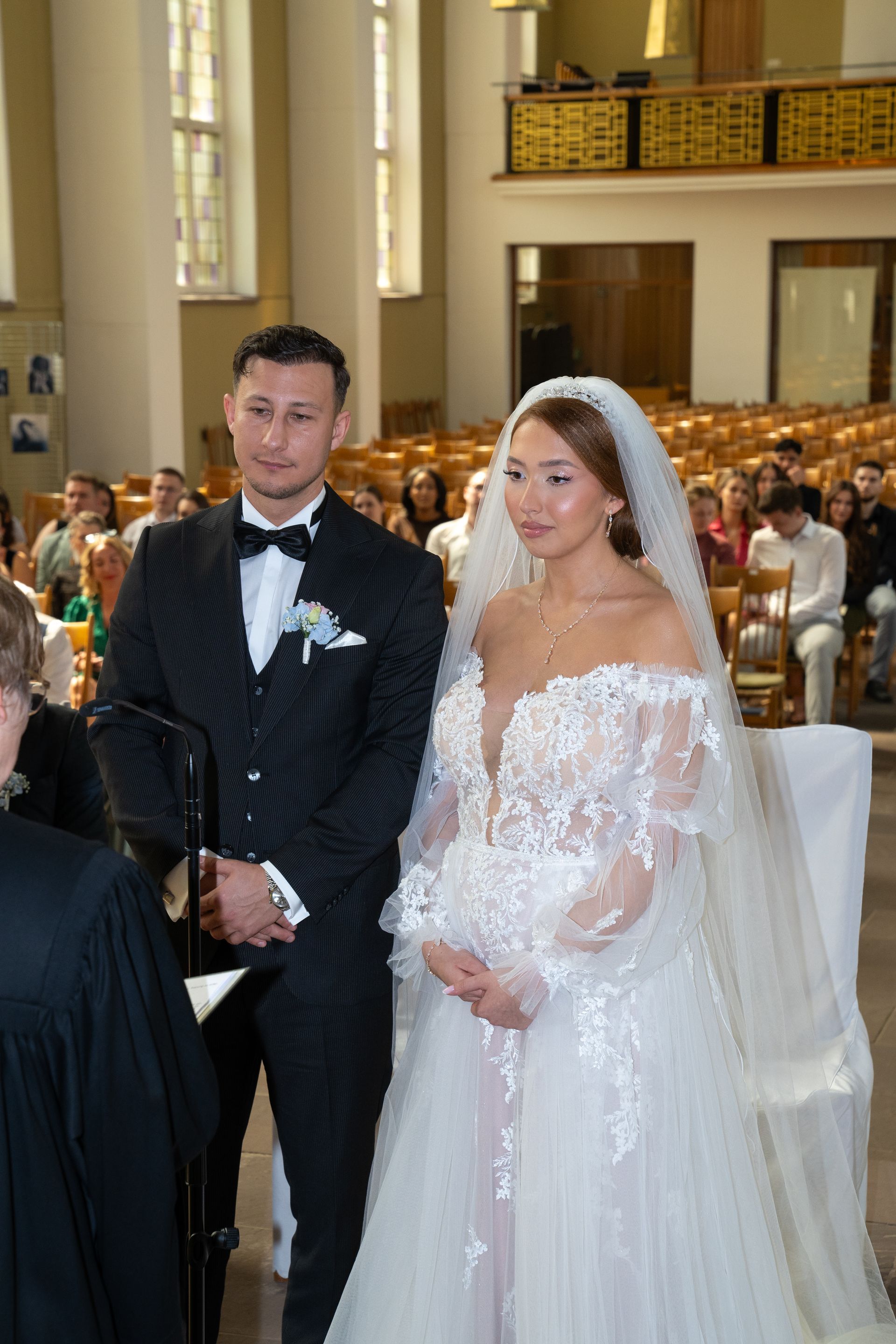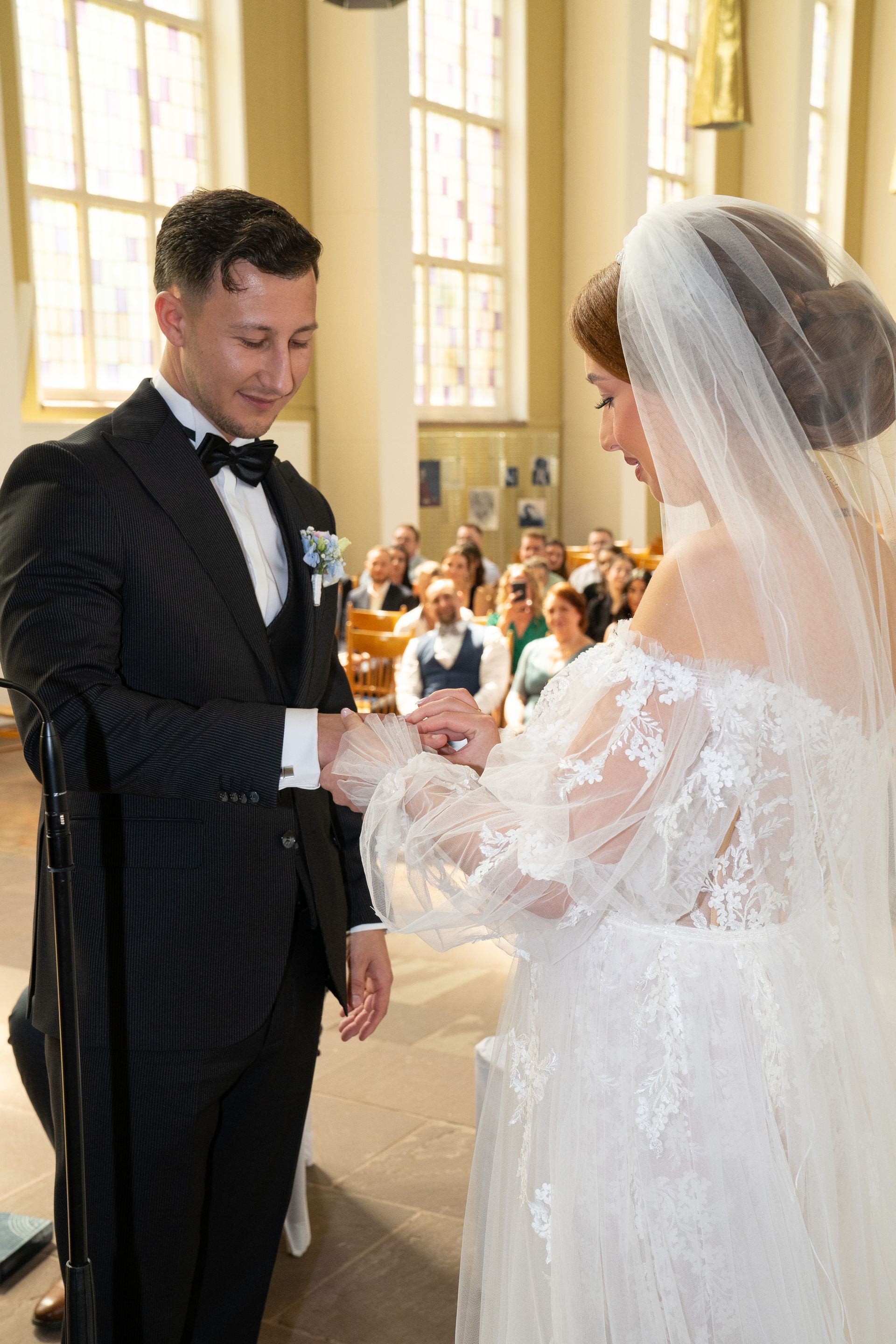 Nach dem Brautpaar-Shooting ging es weiter nach Bremen, wo eine feierliche kirchliche Trauung in einer wunderschönen katholischen Kirche stattfand. Die eindrucksvolle Architektur der Kirche und die romantische Atmosphäre schufen den perfekten Rahmen für diesen emotionalen Moment. Evelina und Vladimir gaben sich in Anwesenheit ihrer Familie und Freunde das Eheversprechen, begleitet von stimmungsvoller Musik und berührenden Worten des Priesters.