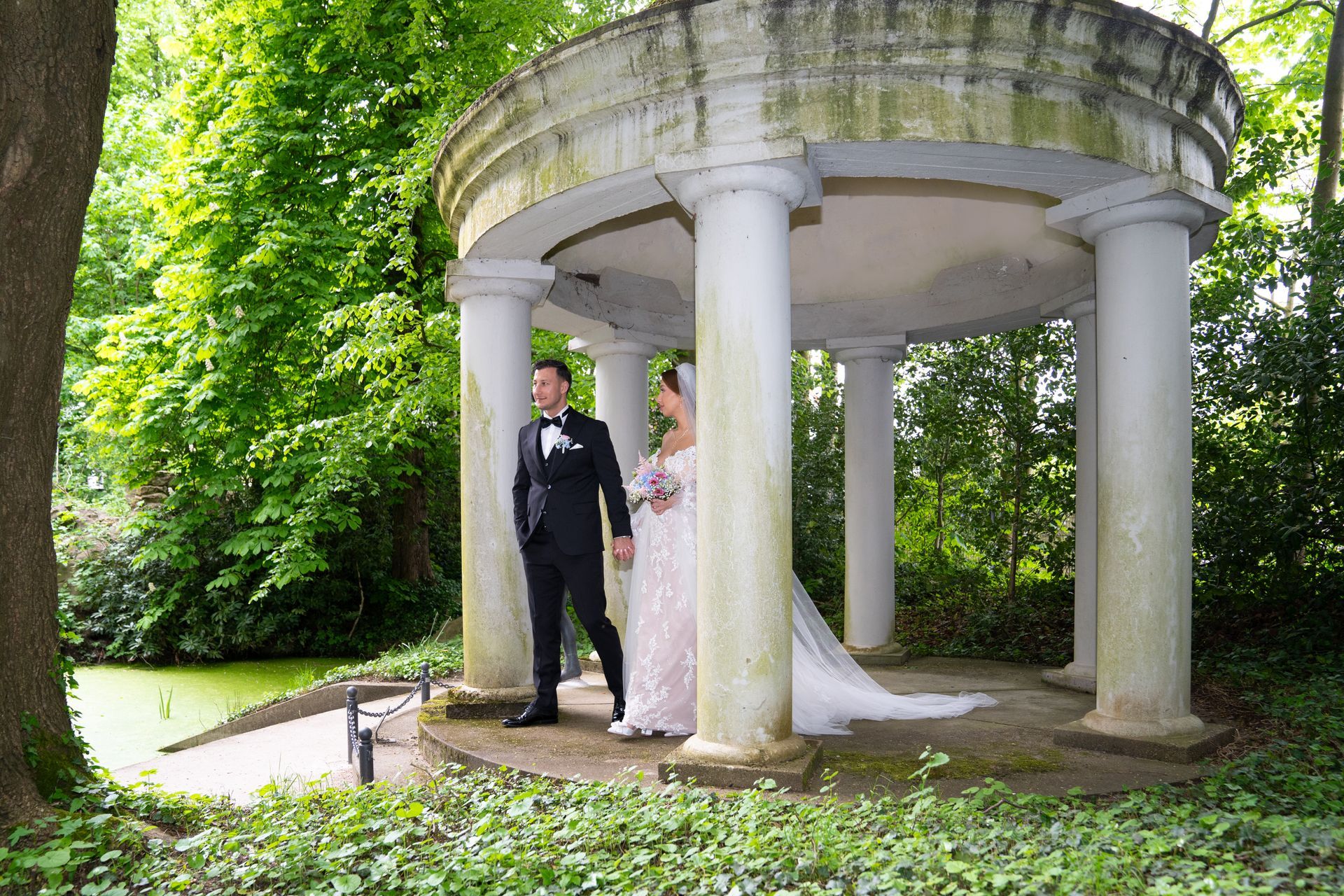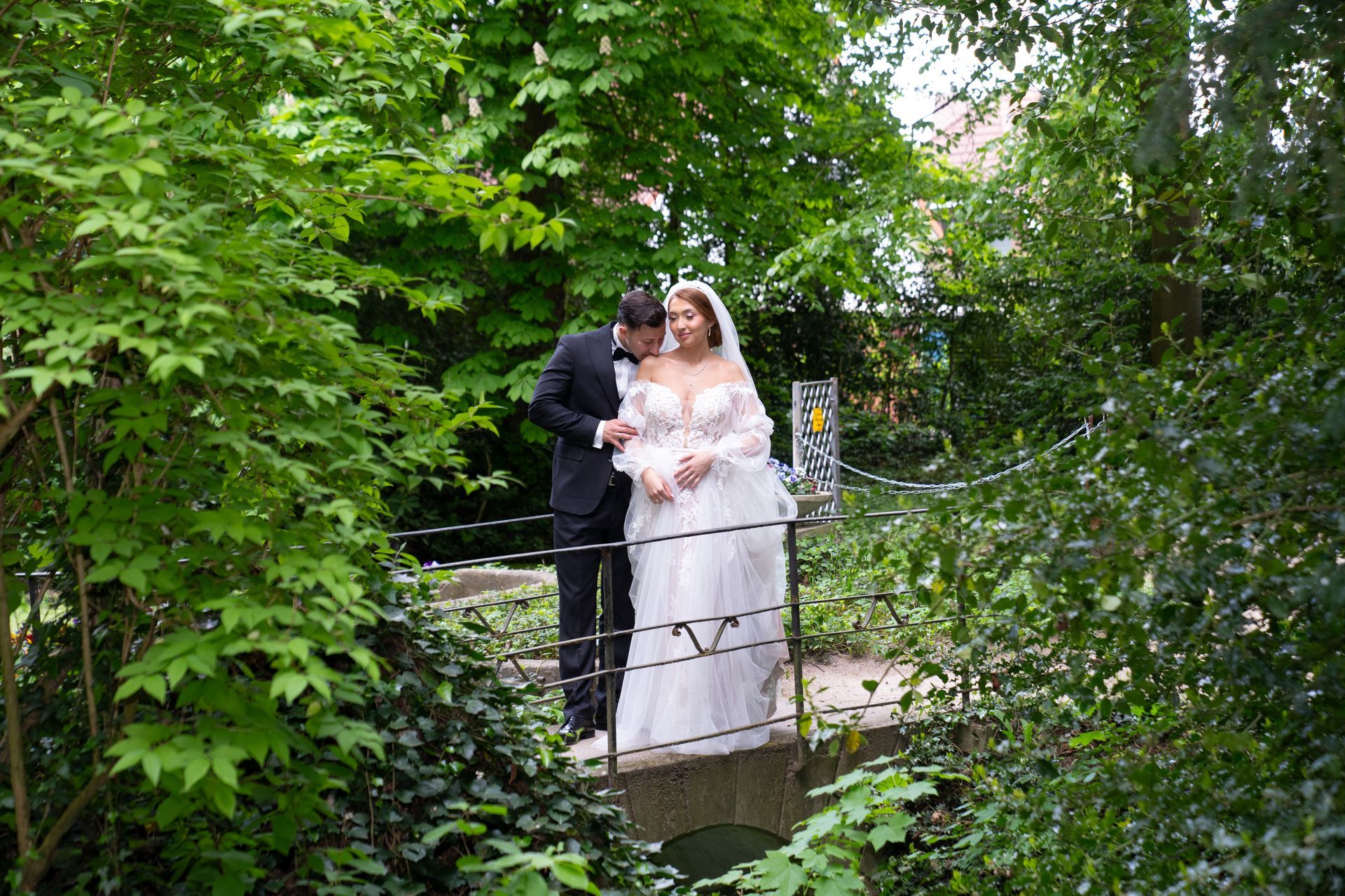 Für das Brautpaar-Shooting wählten Evelina und Vladimir einen idyllischen Garten mit einem kleinen Teich, einer romantischen Brücke und prachtvollen Blumenbeeten. Die altmodische Architektur des Gartens verlieh den Hochzeitsfotos eine zeitlose Eleganz.
