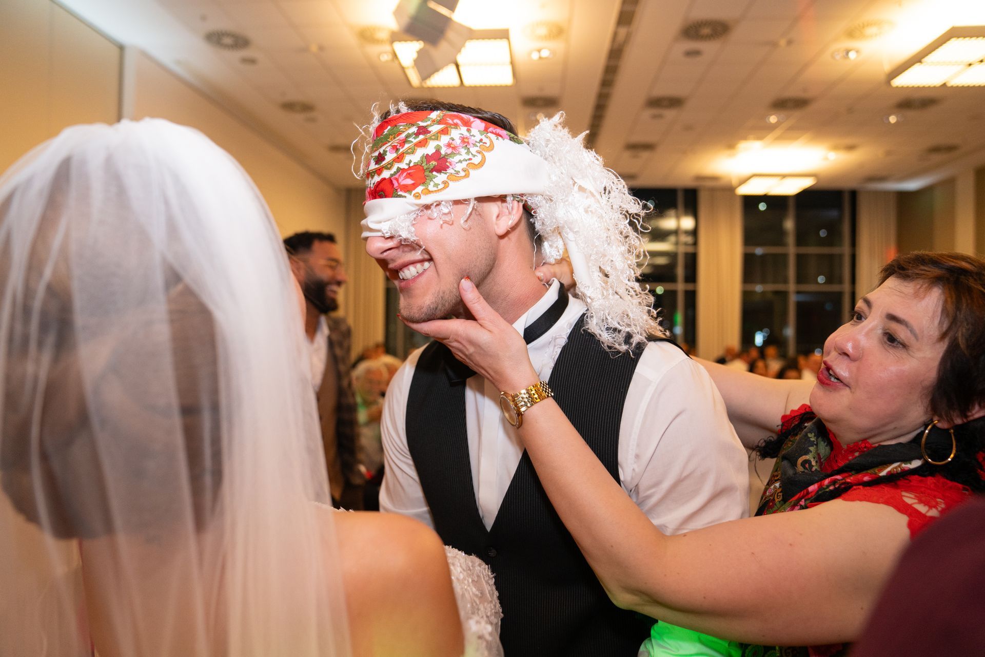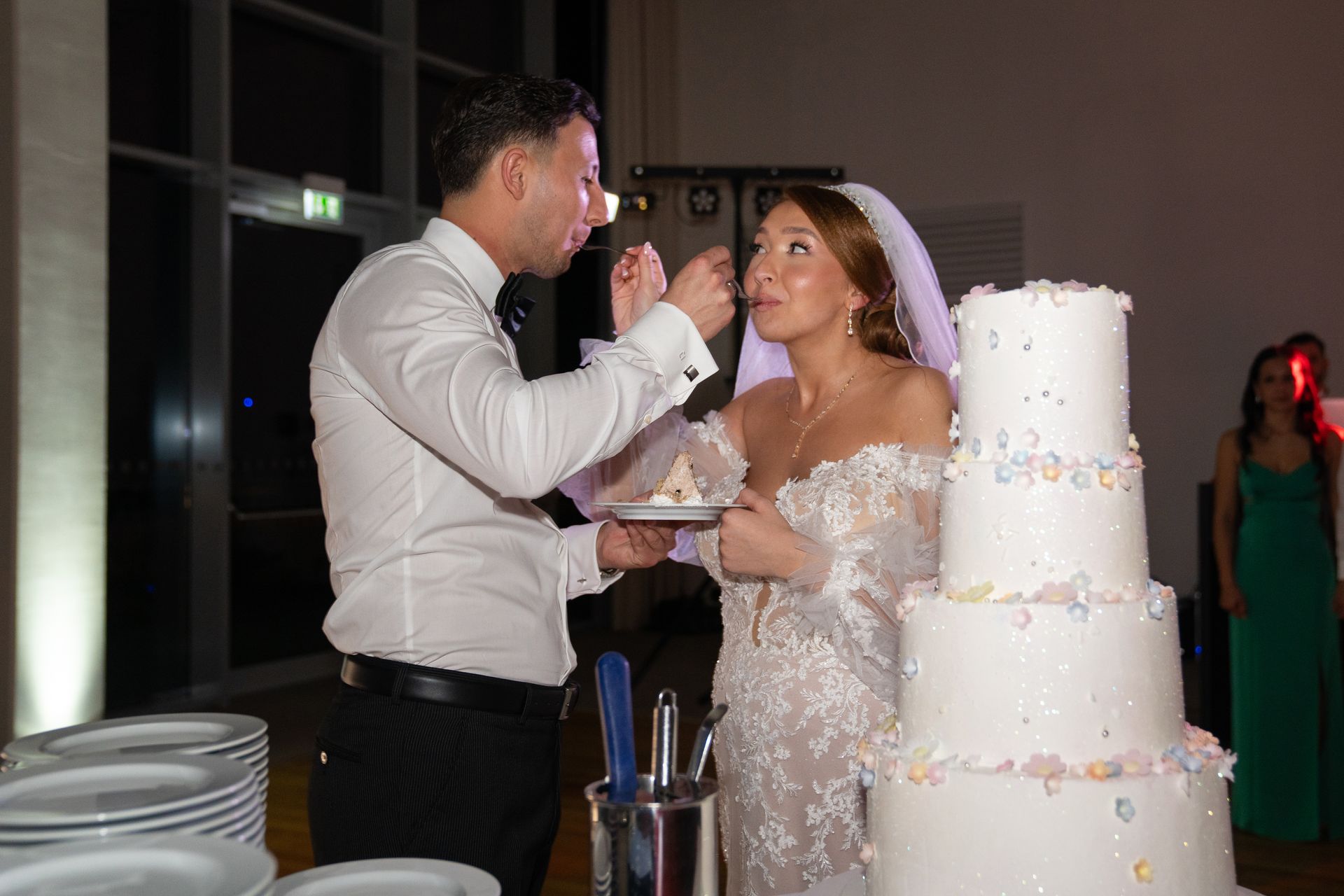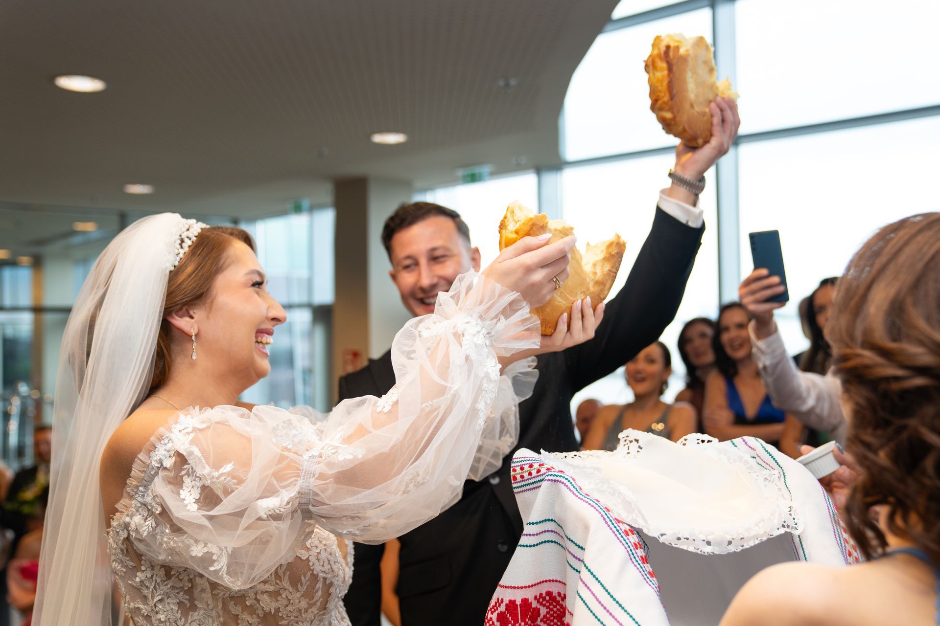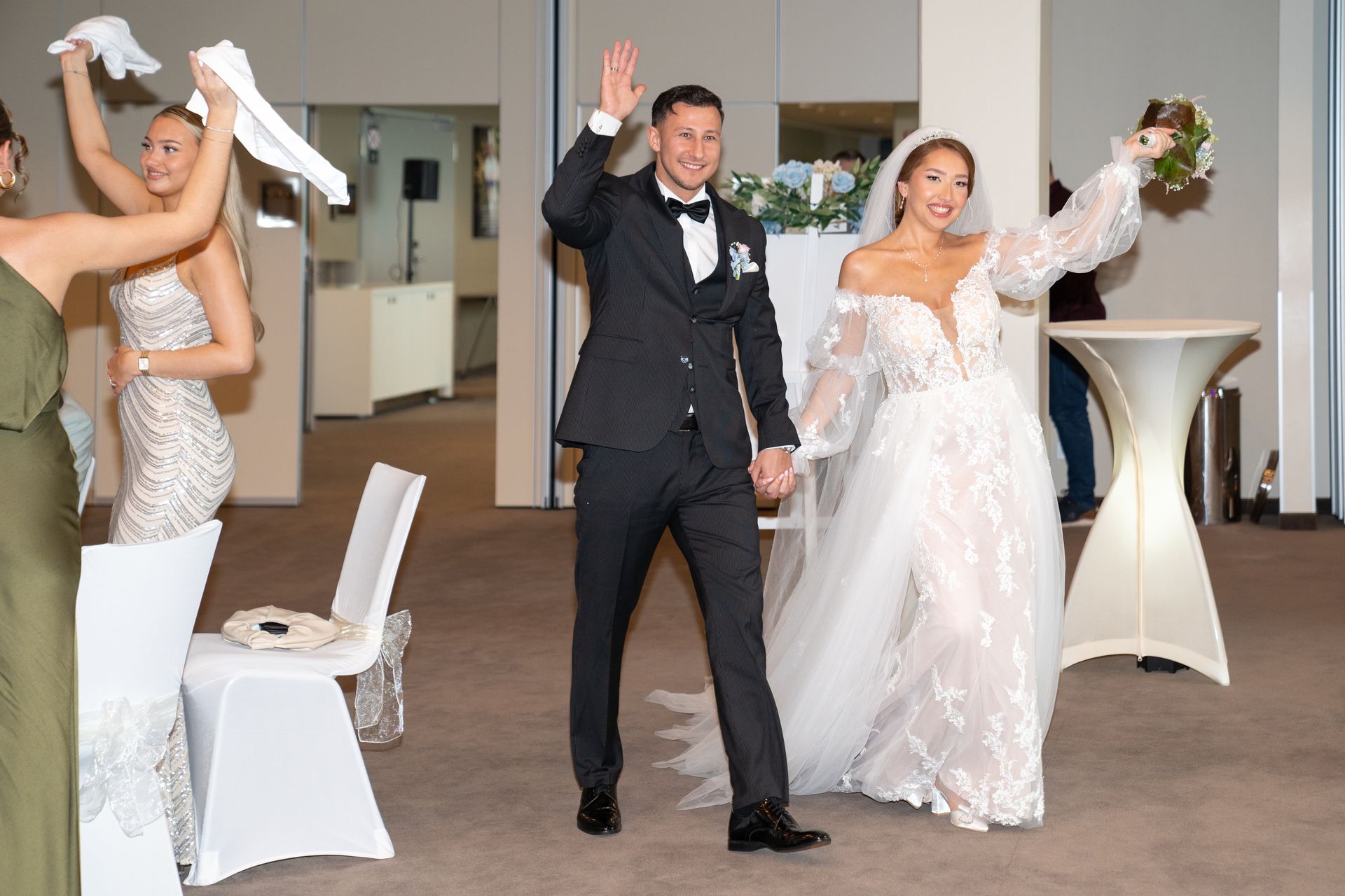 Die Feier fand im eleganten Atlantik Hotel im Herzen von Bremerhaven statt. Das Brautpaar wurde von den Gästen in der Lobby mit großer Freude empfangen. Eine besondere Tradition war das Begrüßungsritual mit einem Karawai (traditionelles Brot), bei dem Evelina und Vladimir ein Stück salzen und einander füttern mussten.