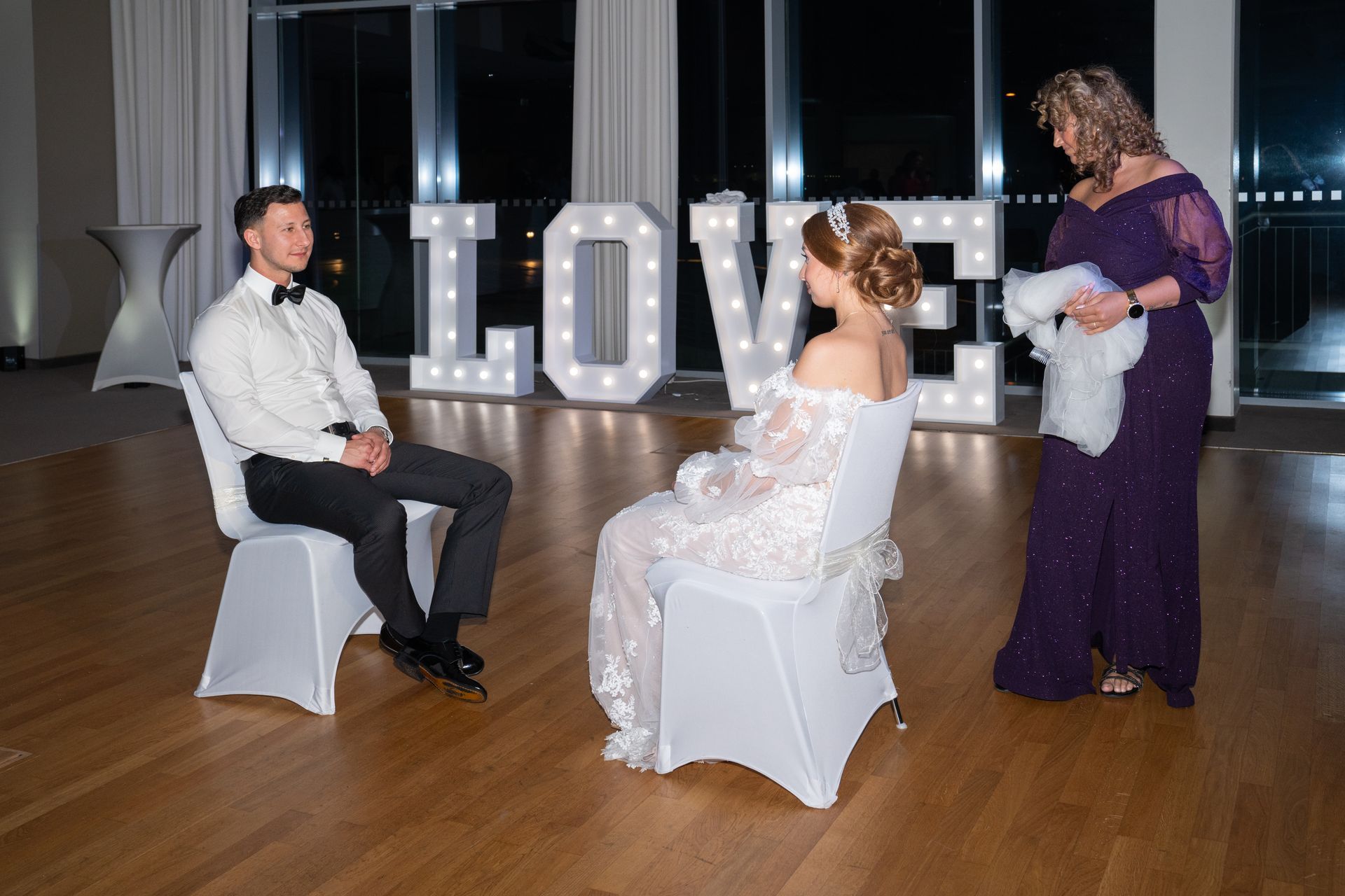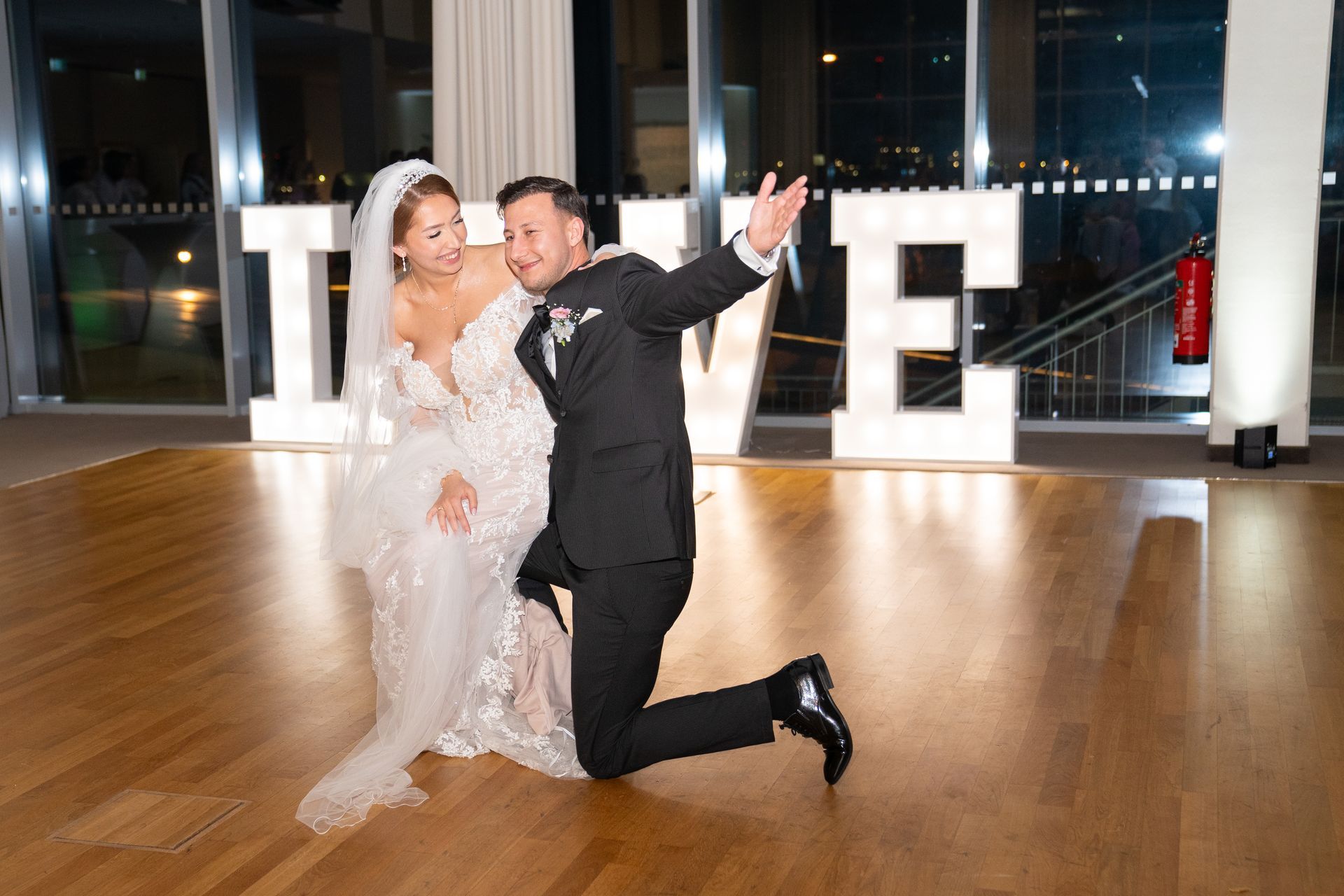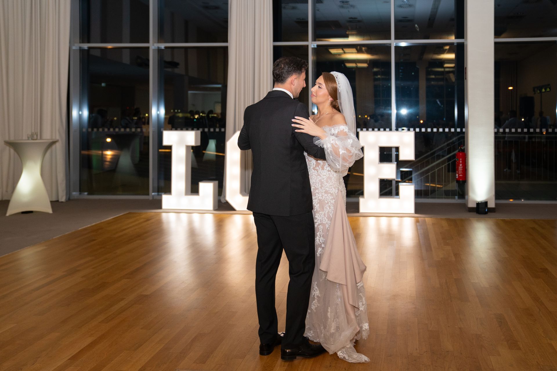 Im festlich dekorierten Hochzeitssaal, der mit großen Fenstern und einem atemberaubenden Blick auf das Wasser und die Promenade begeisterte, begann die Feier. Die großen "LOVE"-Buchstaben vor den Fenstern waren ein beliebter Hintergrund für Fotos.