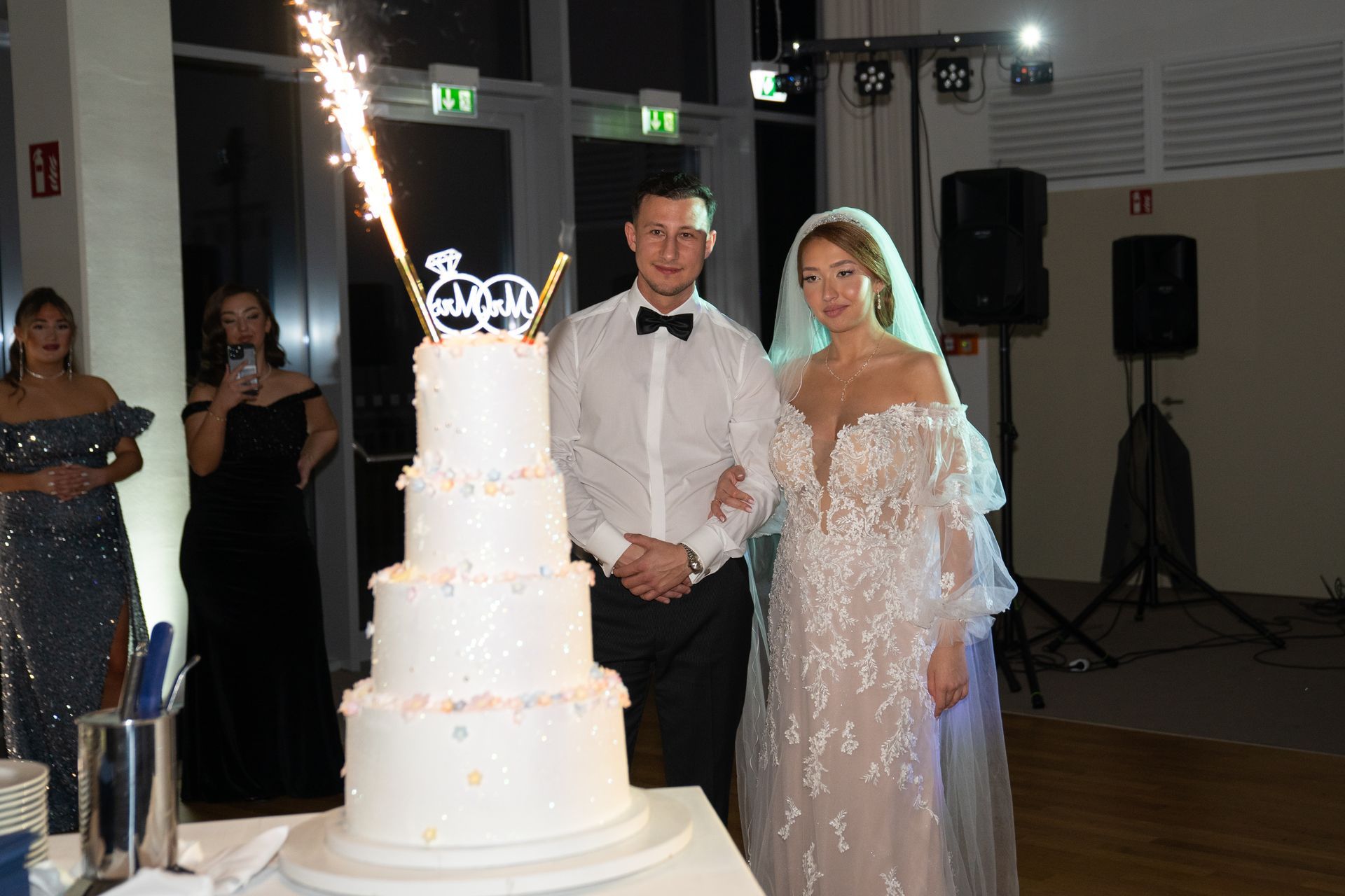 Kurz vor Mitternacht wurde die Hochzeitstorte mit Konfetti und einem kleinen Feuerwerk präsentiert. Die Torte wurde gemeinsam probiert und anschließend unter den Gästen verteilt.