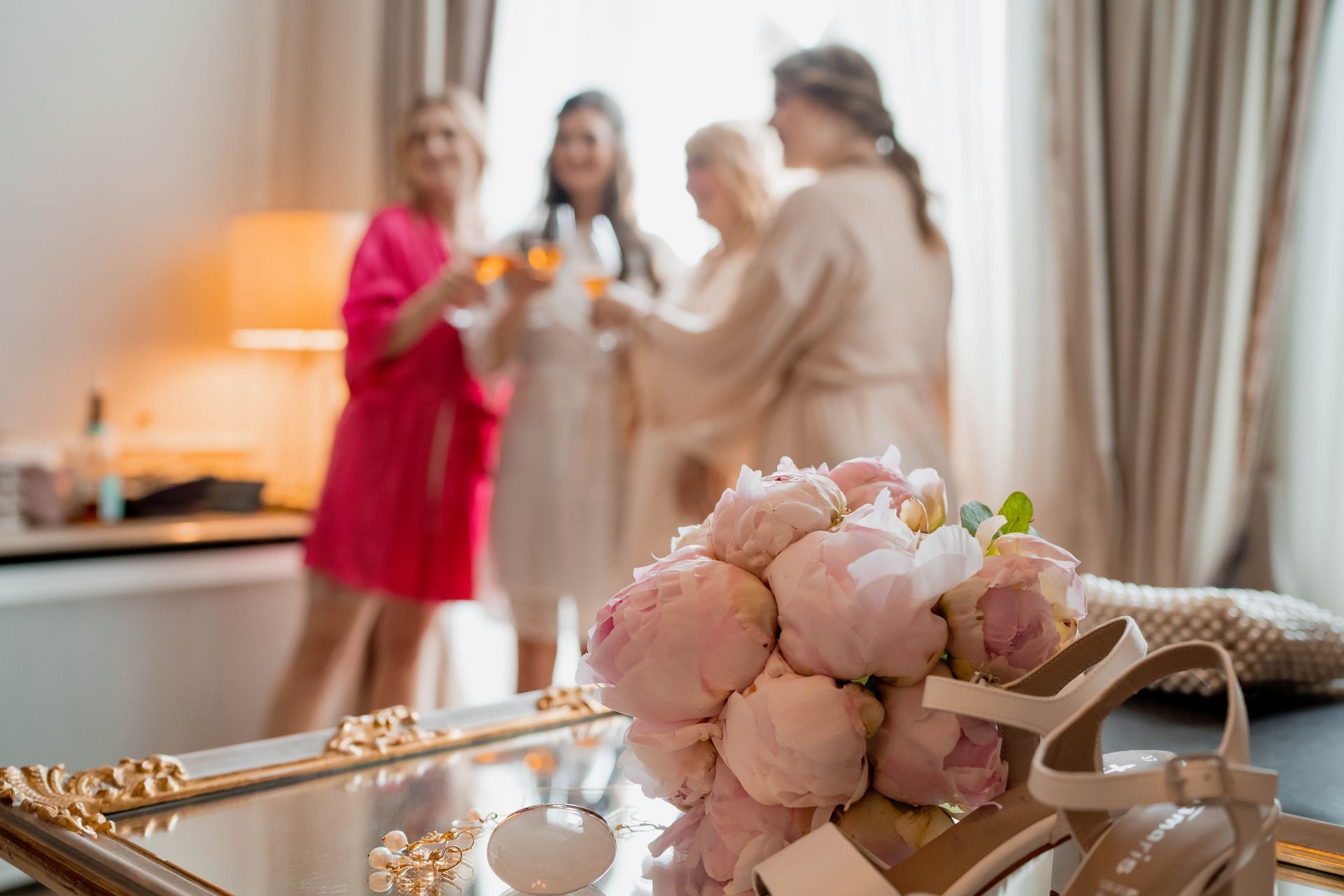 Der Tag begann in einem eleganten Apartment des Hotels, wo die Braut Veronika mit ihrem Getting Ready verzauberte. Inmitten von luxuriöser Einrichtung und stilvoller Atmosphäre wurde sie von ihrer Stylistin perfekt geschminkt und gekleidet. Parallel dazu bereitete sich der Bräutigam Gerrit in einem separaten Raum vor, um seinem großen Moment entgegenzufiebern.