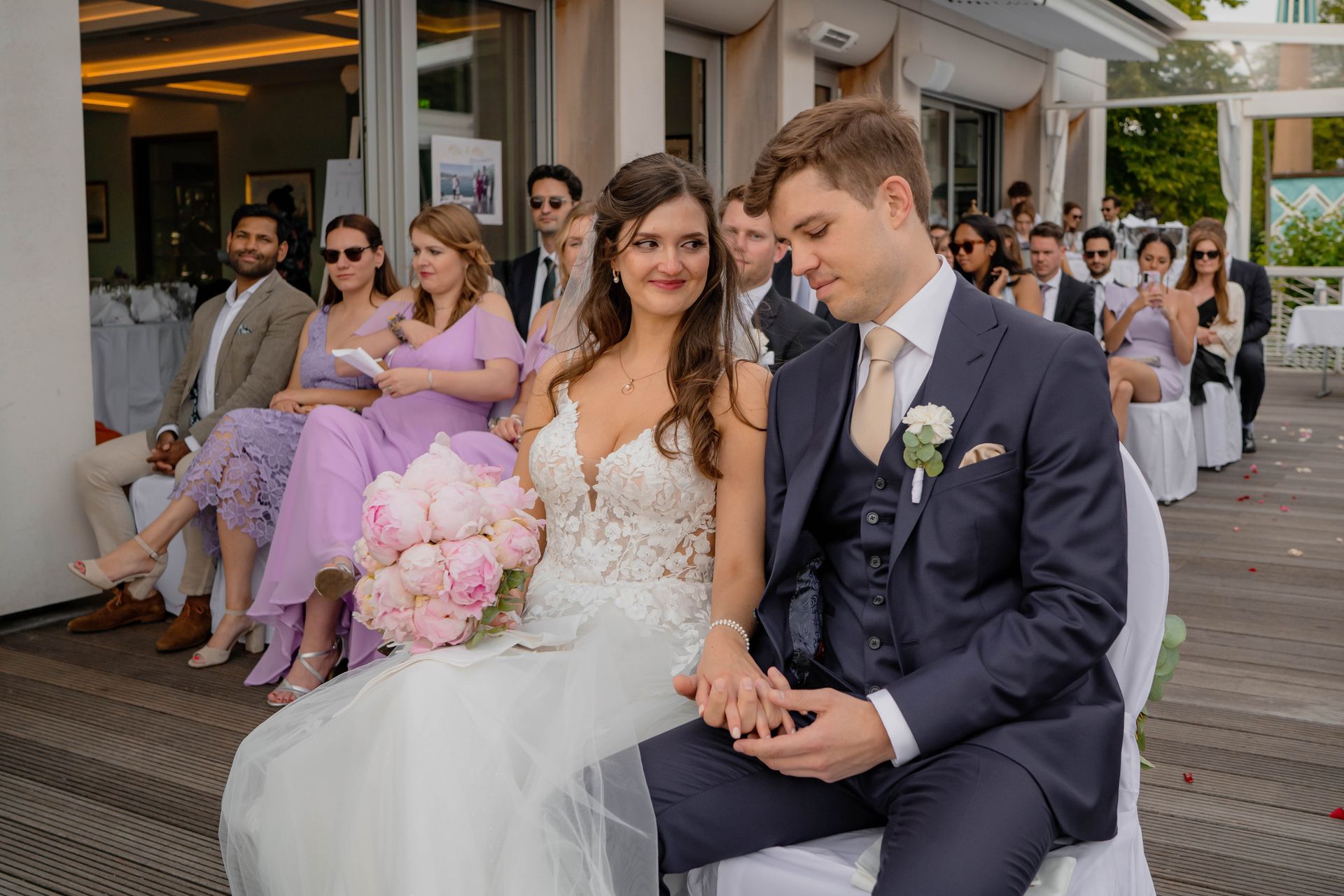 Nach der standesamtlichen Trauung führte die Bootsfahrt das Brautpaar und die Gäste zu einem idyllischen Restaurant am Ufer der Elbe. Dort wartete die nächste Überraschung: Eine freie Trauung auf der liebevoll dekorierten Terrasse mit Blick auf den Fluss. Das sonnige Wetter und die emotionale Ansprache der Traurednerin verliehen der Zeremonie eine magische Atmosphäre.