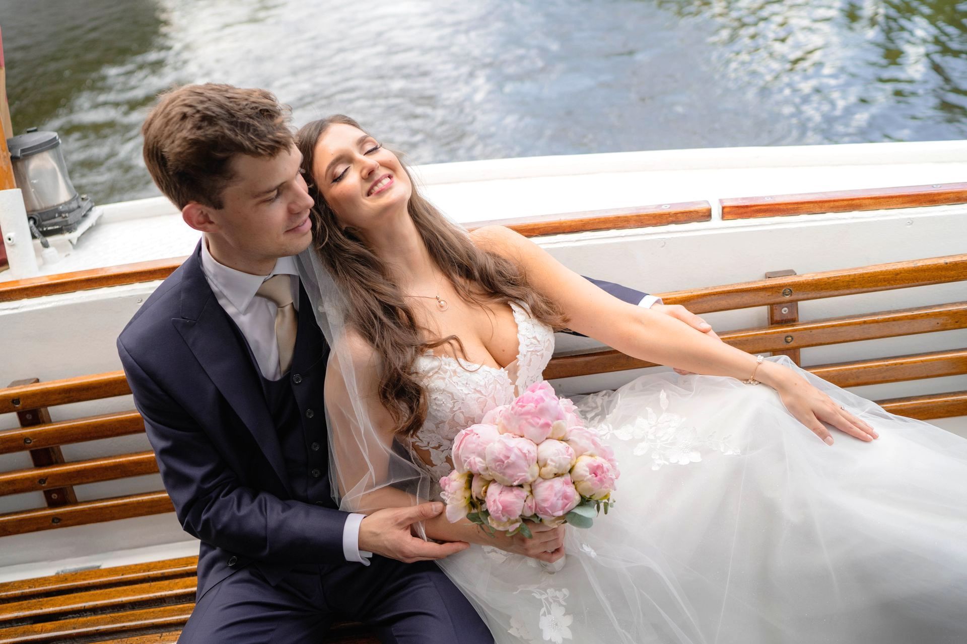 Nach dem First Look nutzten wir die charmanten Ecken des Hotels für ein exklusives Paarshooting. Die Hotellobby, der Fahrstuhl und der Haupteingang boten uns einzigartige Kulissen, um die besondere Verbindung zwischen Veronika und Gerrit einzufangen. Die Romantik des Moments setzte sich fort, als das Paar für einen kleinen Spaziergang zur Alsterhaus-Promenade aufbrach. Dort warteten nicht nur die Gäste, sondern auch ein stilvoll dekoriertes Boot, das das Brautpaar zu weiteren Abenteuern einlud.